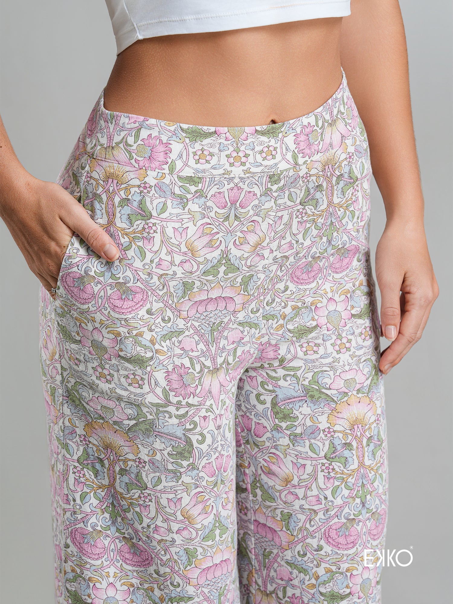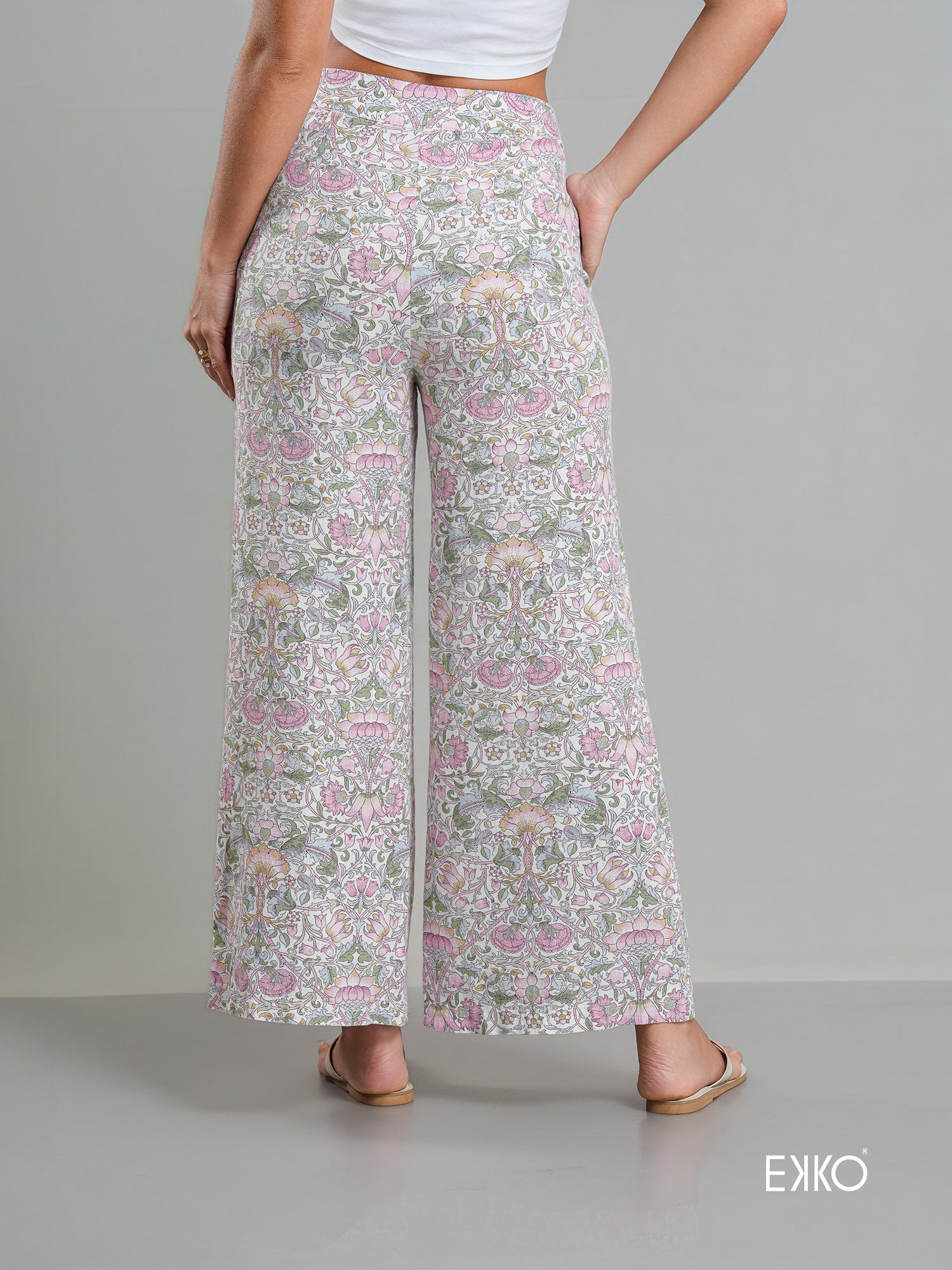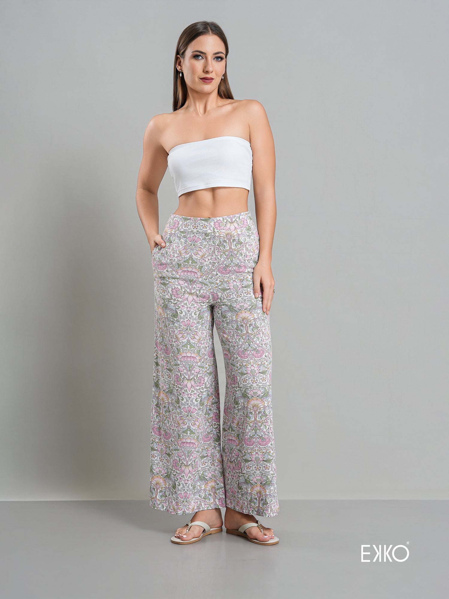 Linen wide-leg pants with a floral print, side seam pockets, and a breezy, comfortable fit. Perfect for casual or chic looks.