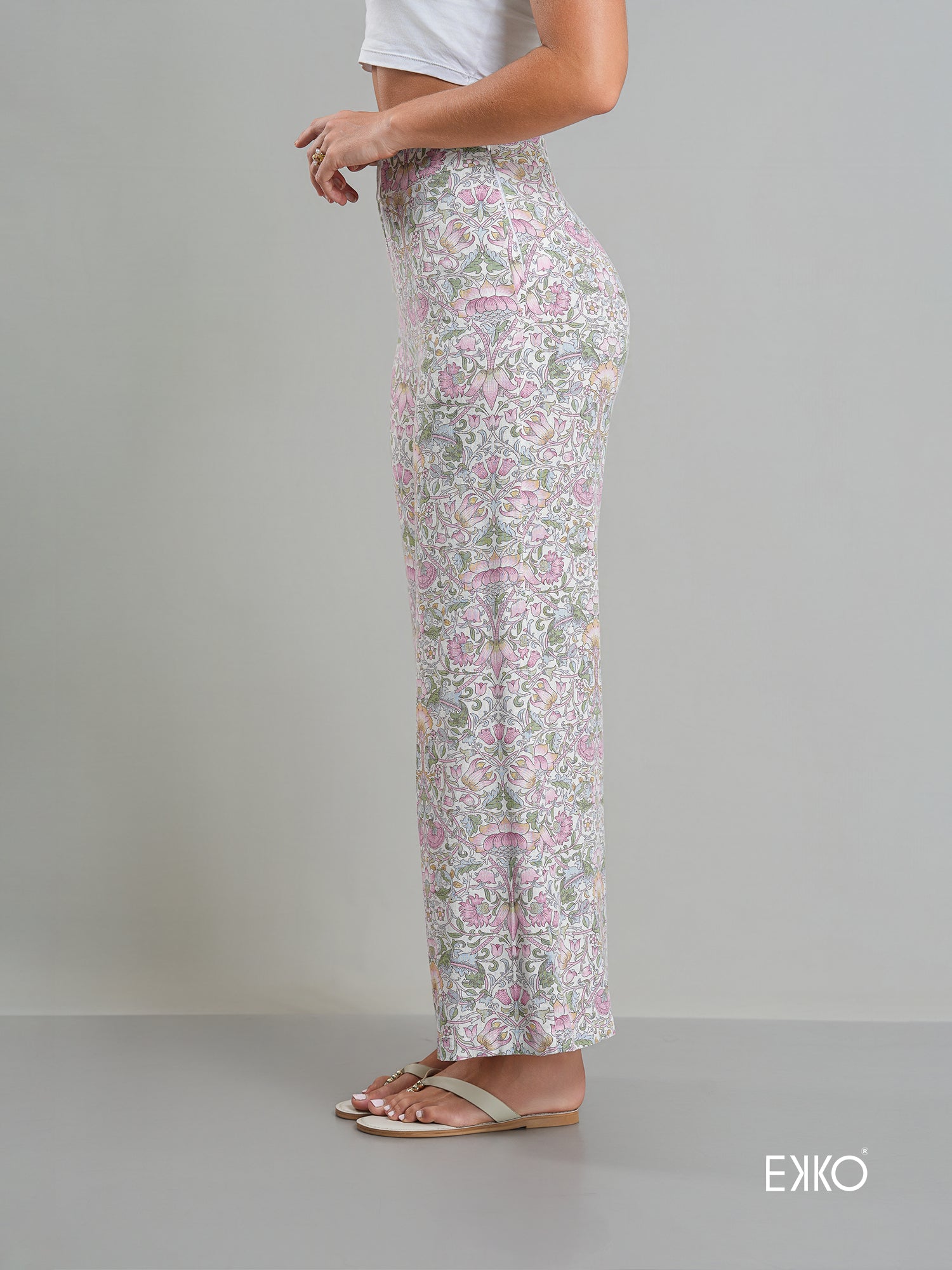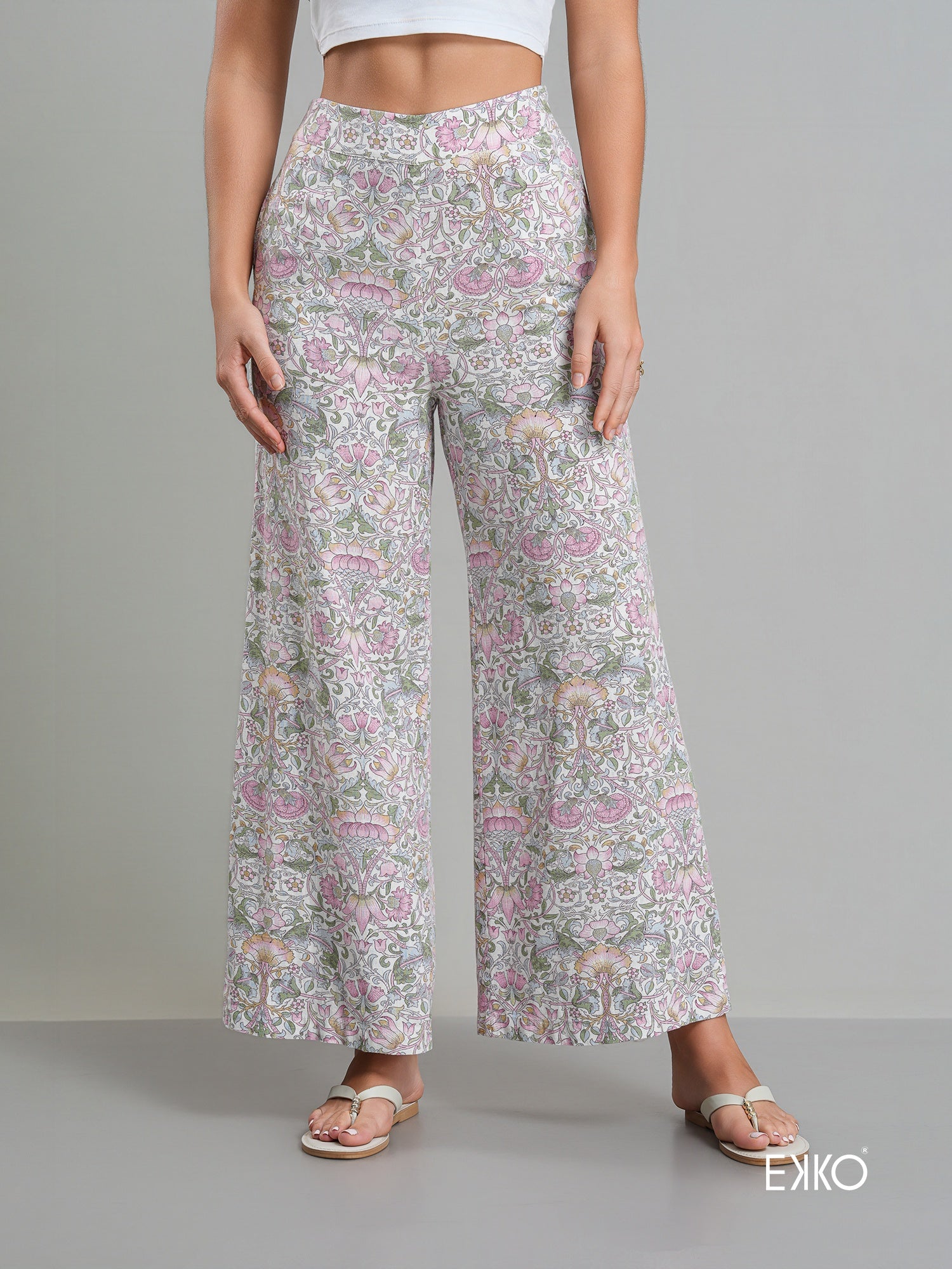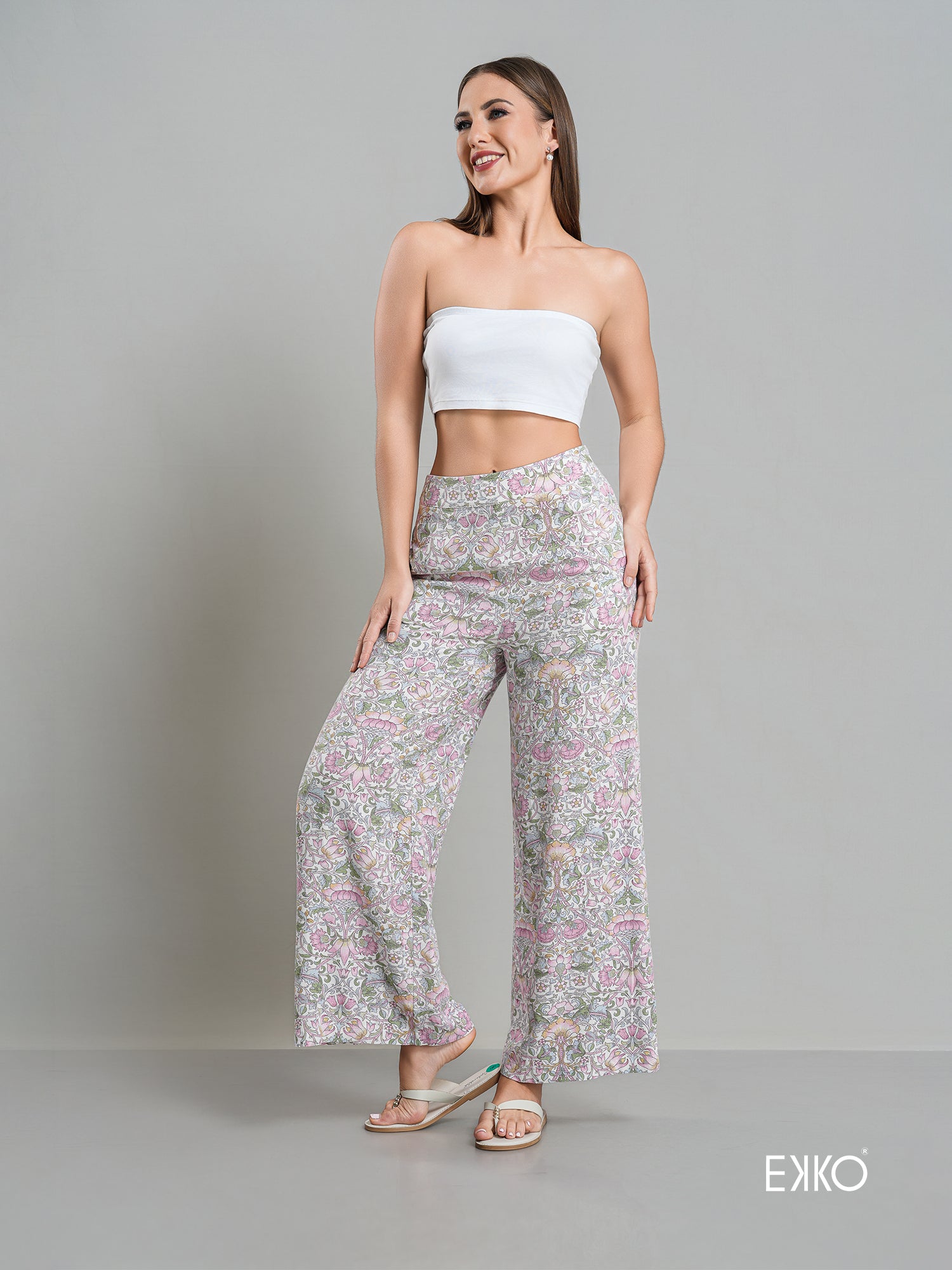 Linen wide-leg pants with a floral print, side seam pockets, and a breezy, comfortable fit. Perfect for casual or chic looks.