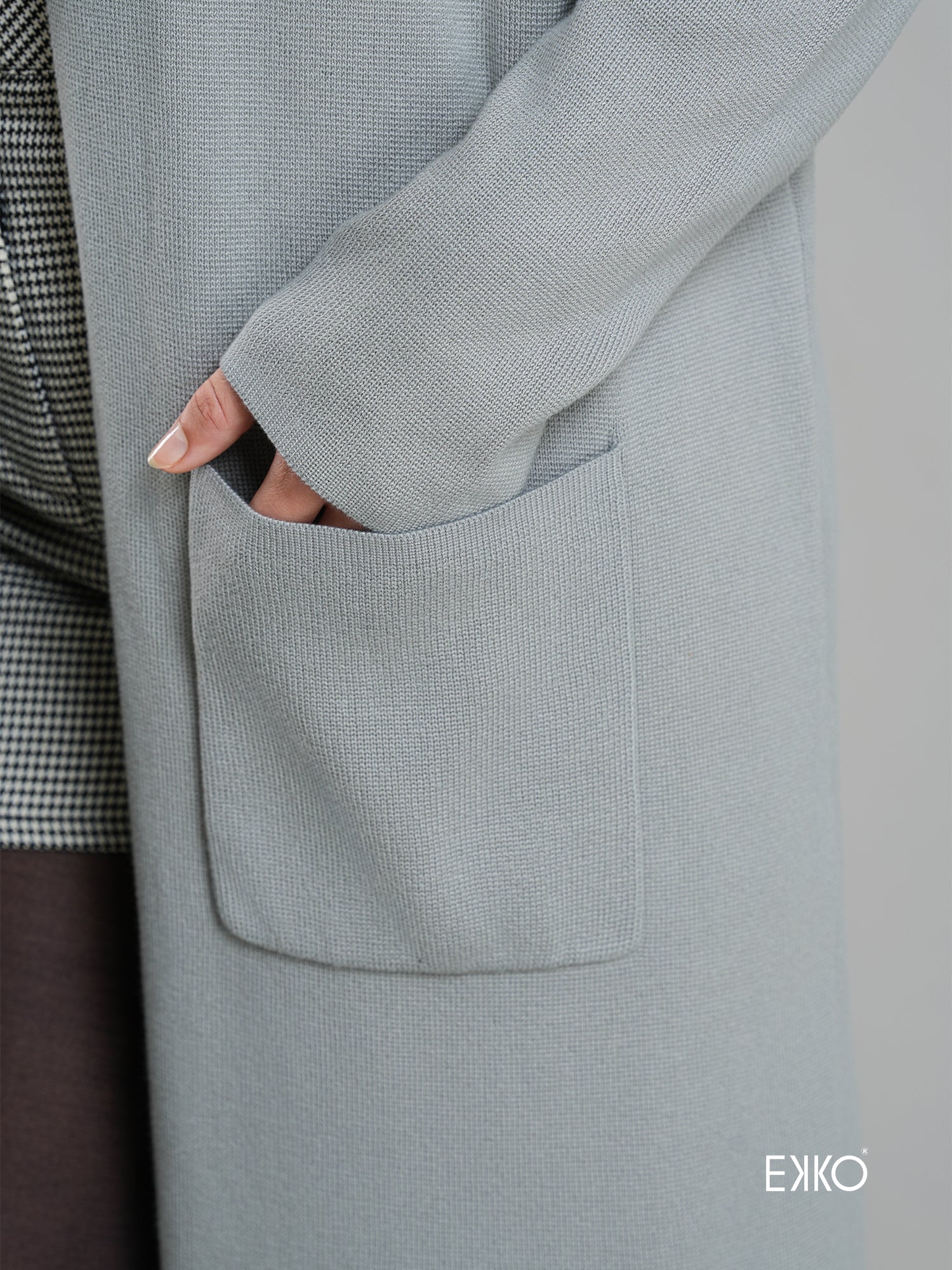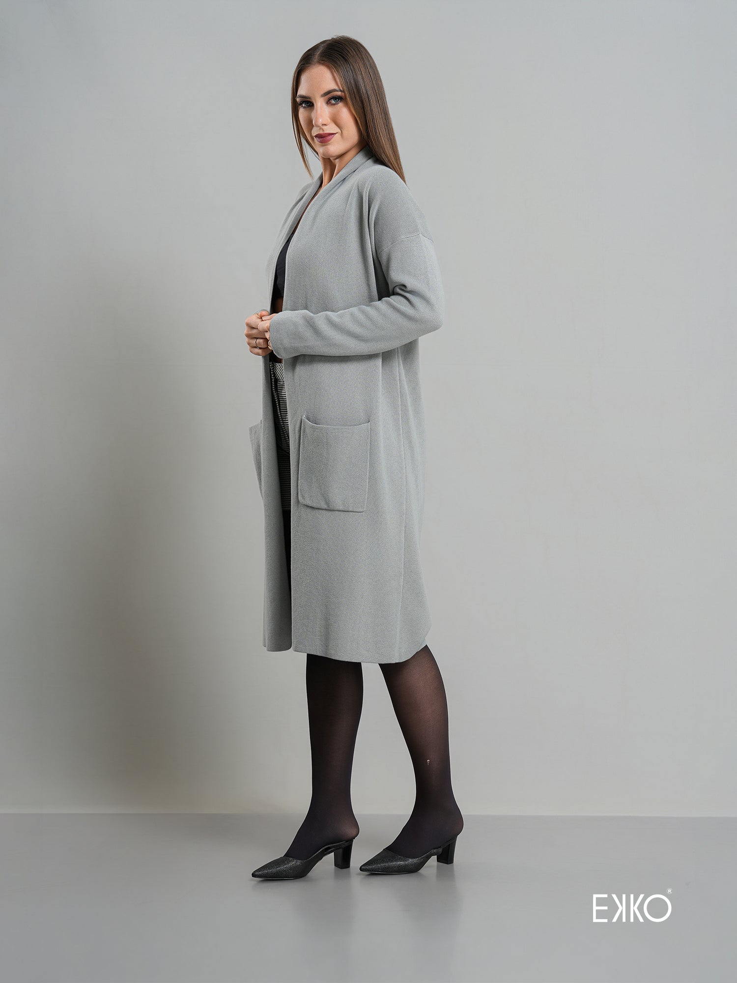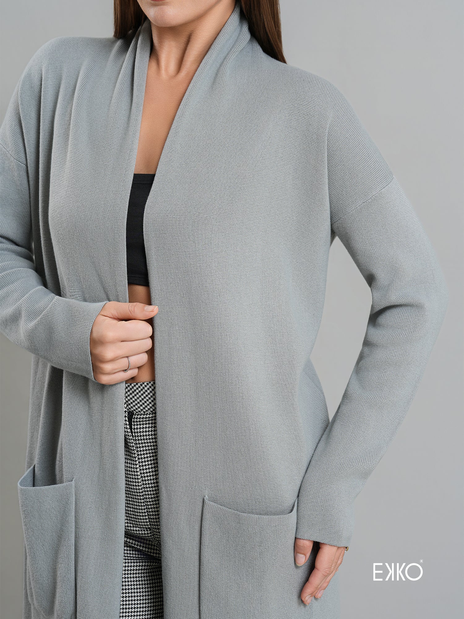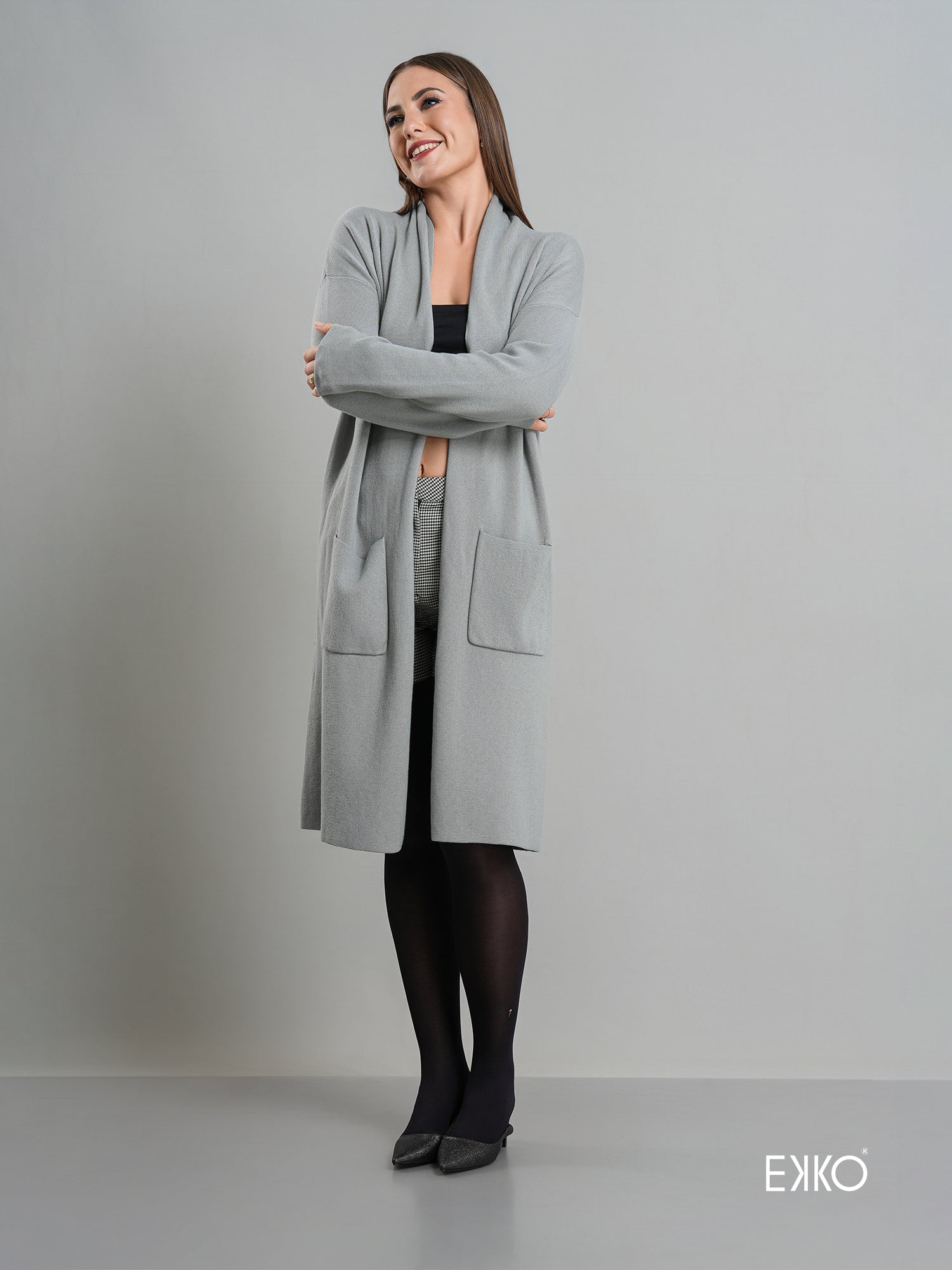 Grey open-front cardigan with patch pockets, long sleeves, and a regular fit. Made from 100% Pima cotton for a soft, comfy feel.