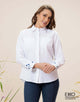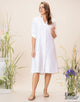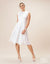 A timeless white workwear dress with a high neckline, a fitted waist, and a graceful flared midi skirt, blending professionalism with elegance.