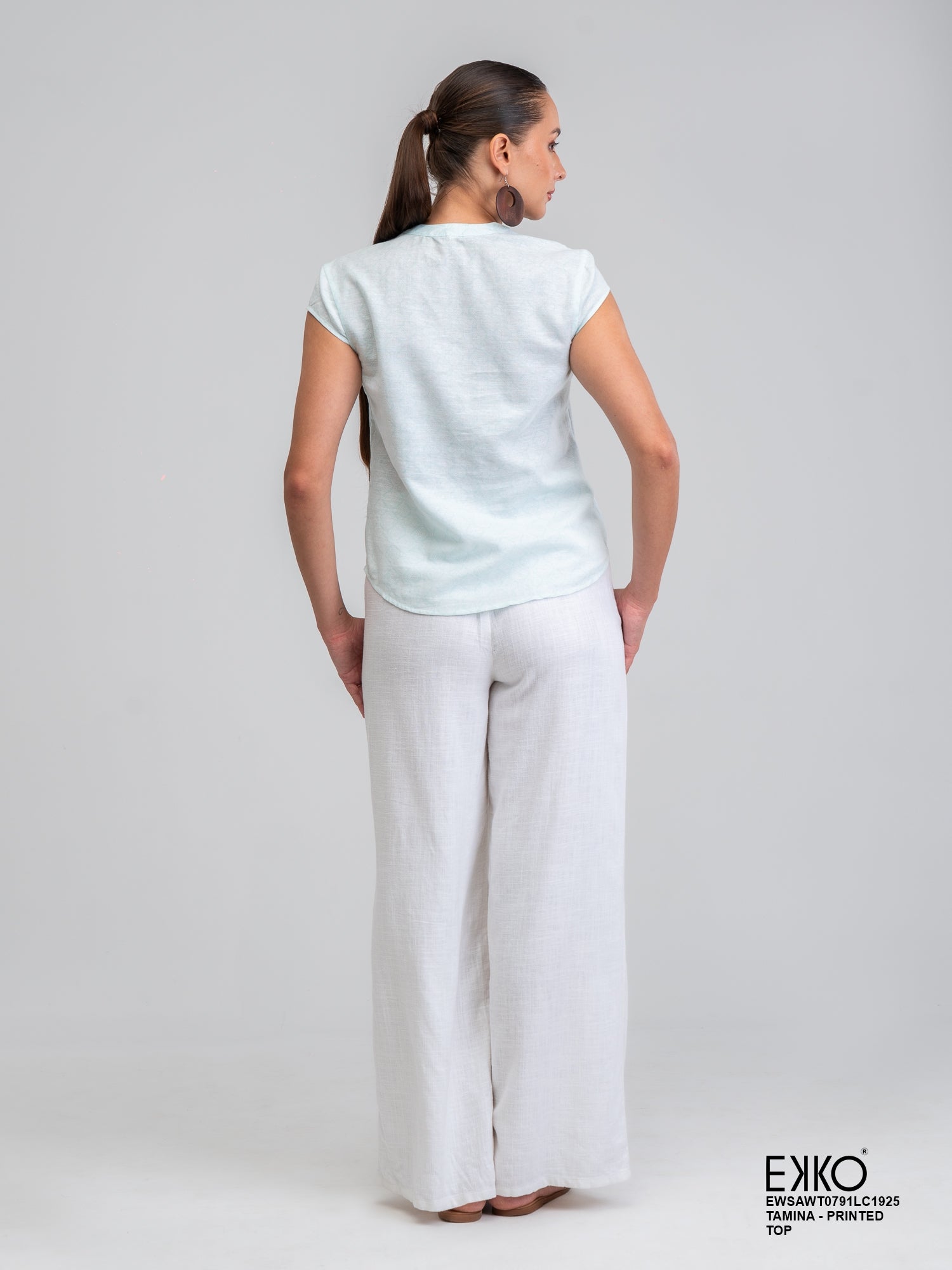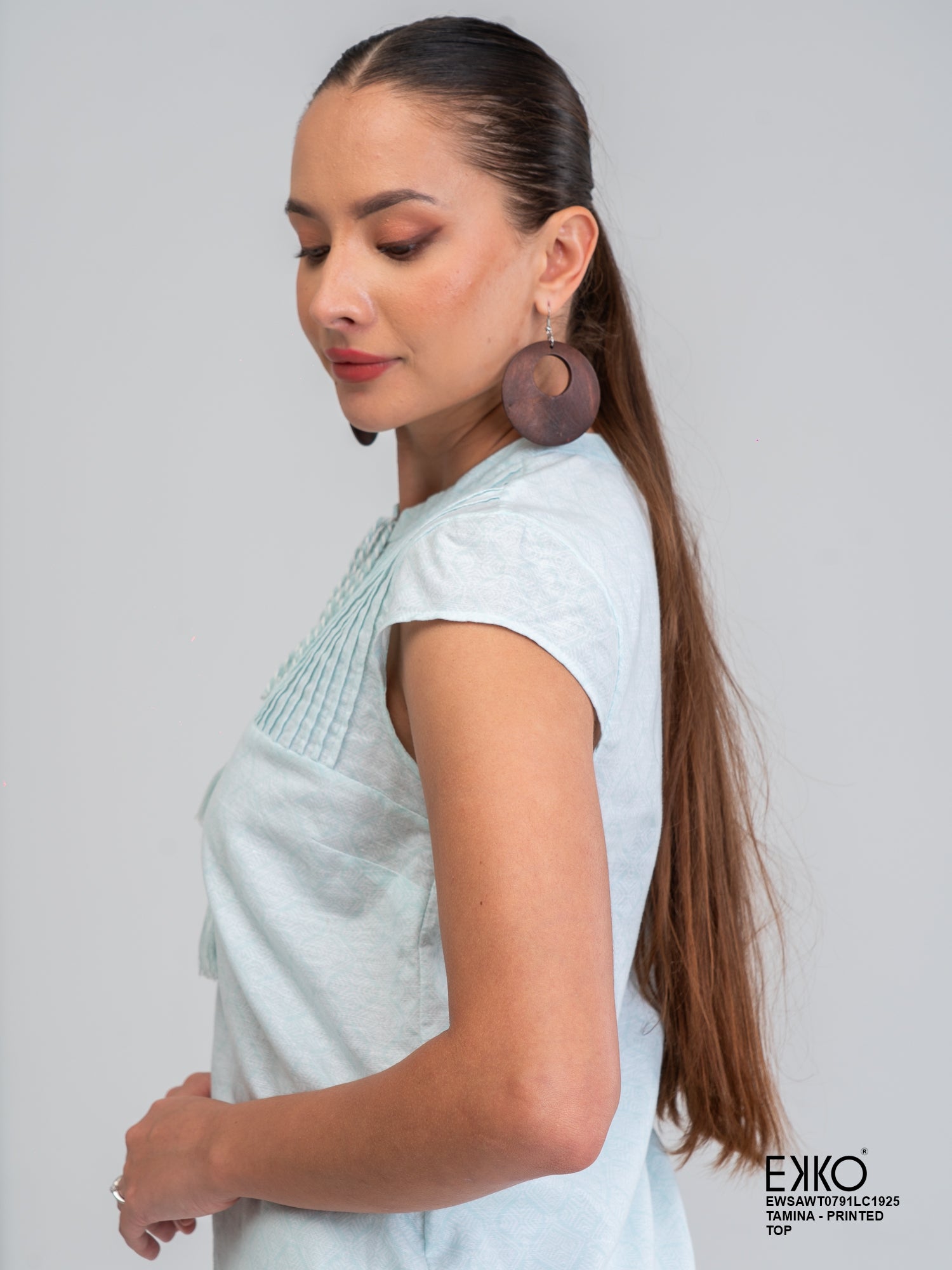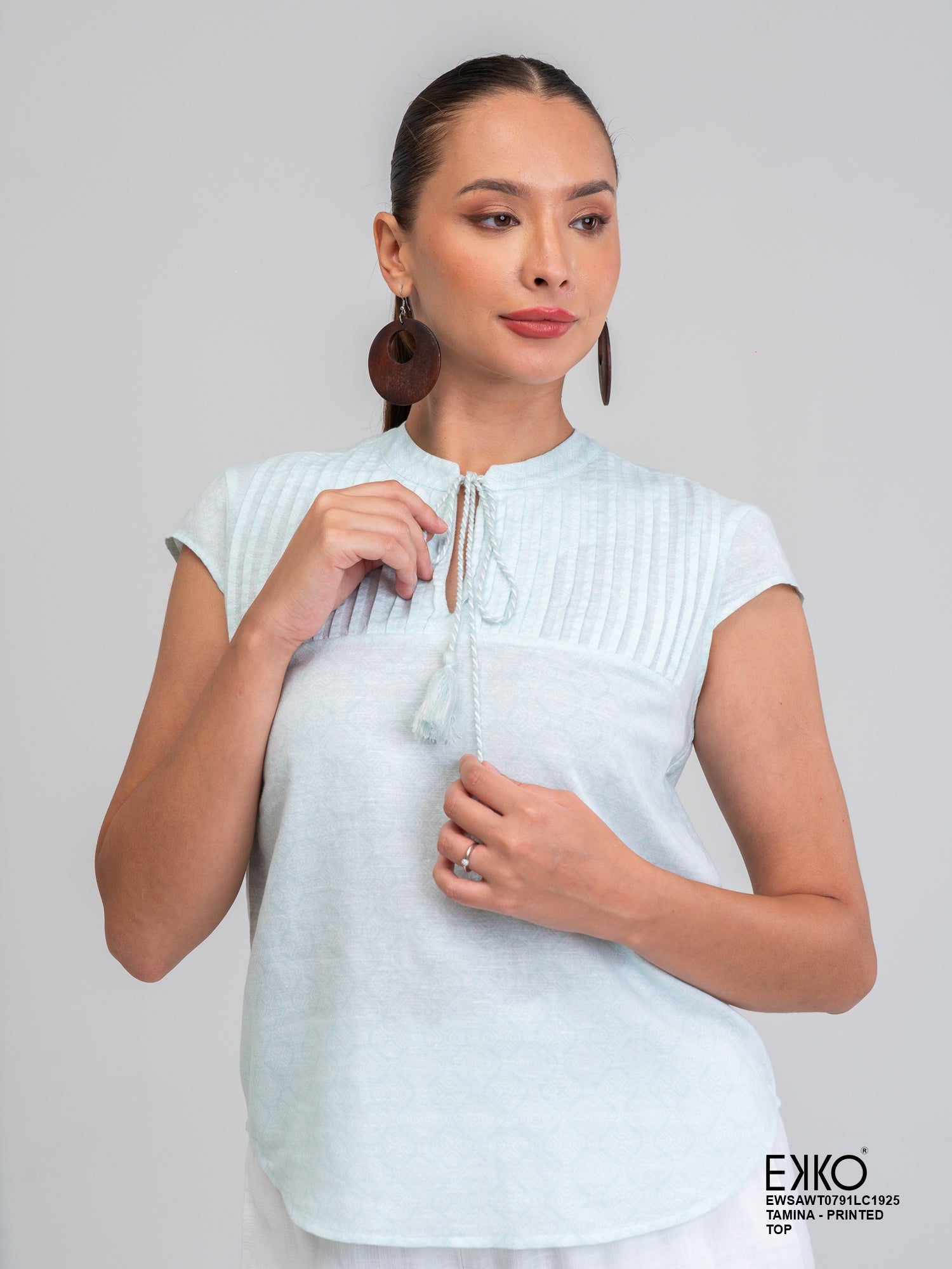 Effortless charm meets subtle detailing this relaxed cap-sleeve top features a front pintuck design and playful tassel tie, perfect for casual days or smart-casual outings.