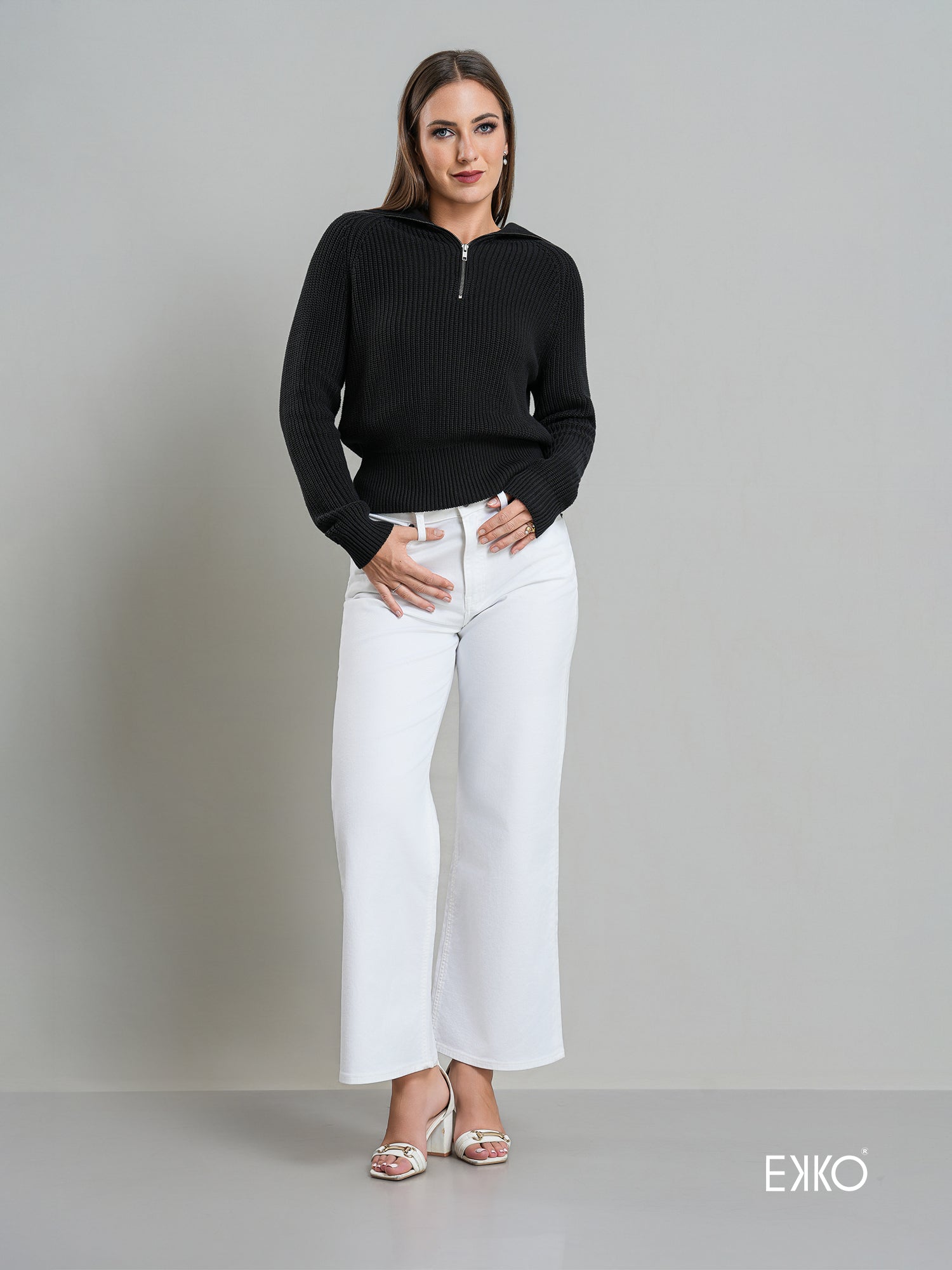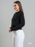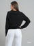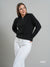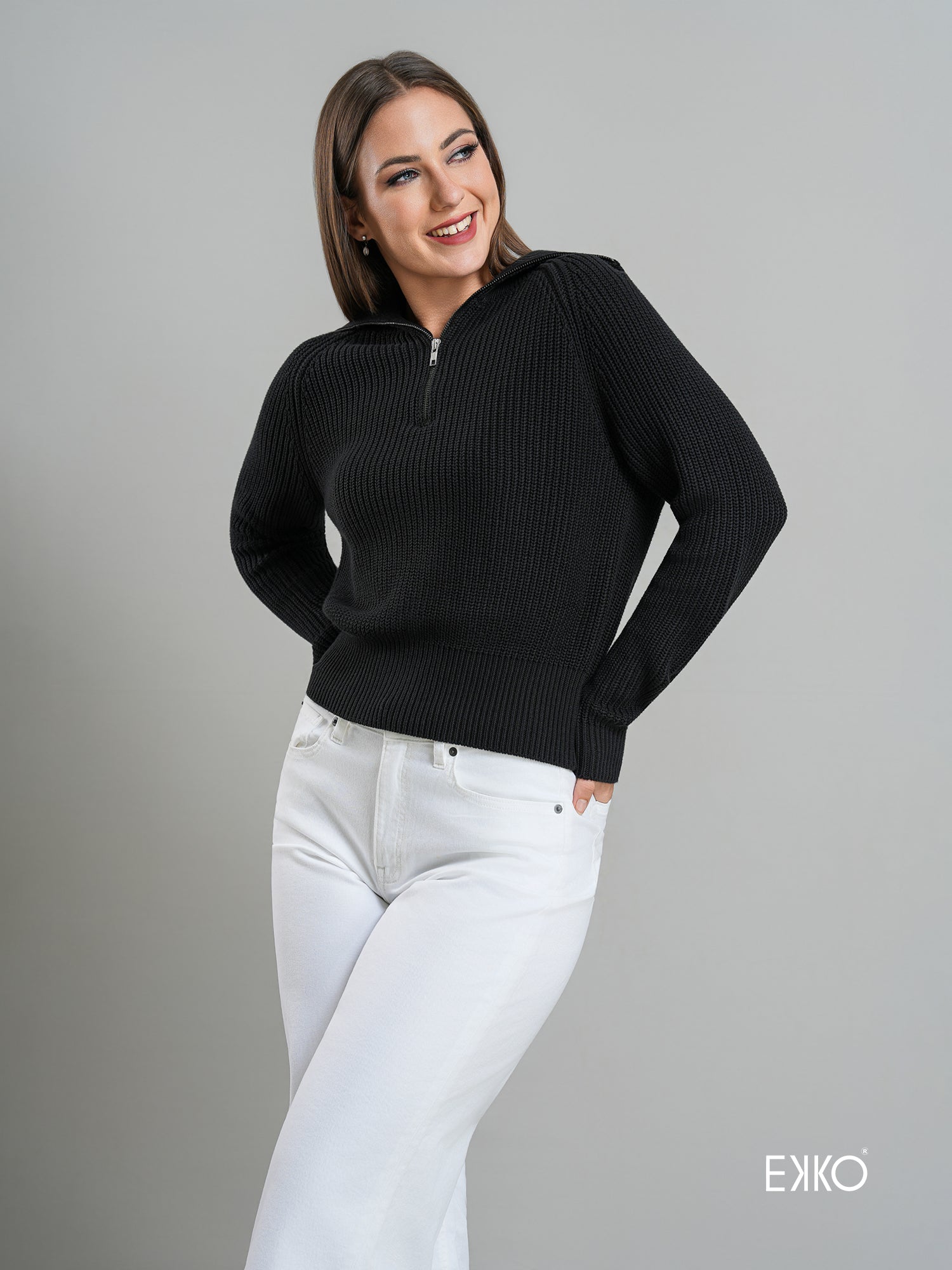 Women's black sweater with a mock neck and half zip, raglan shoulders, long sleeves, and a relaxed fit. Made from 100% organic cotton for a comfy, effortless look.