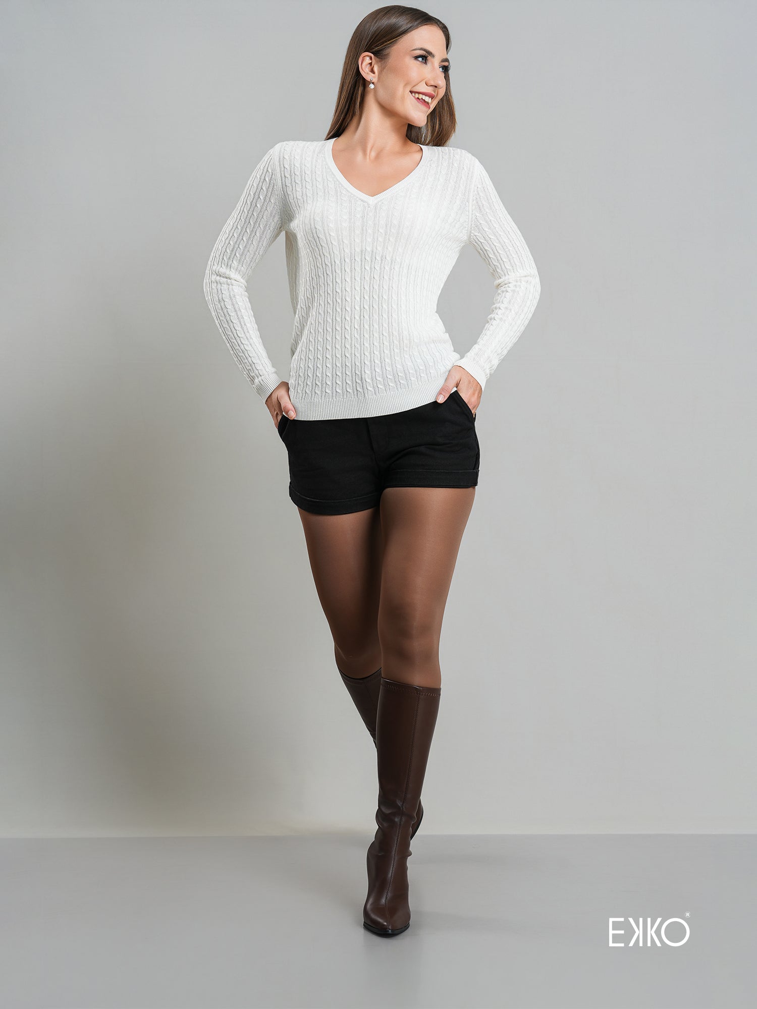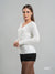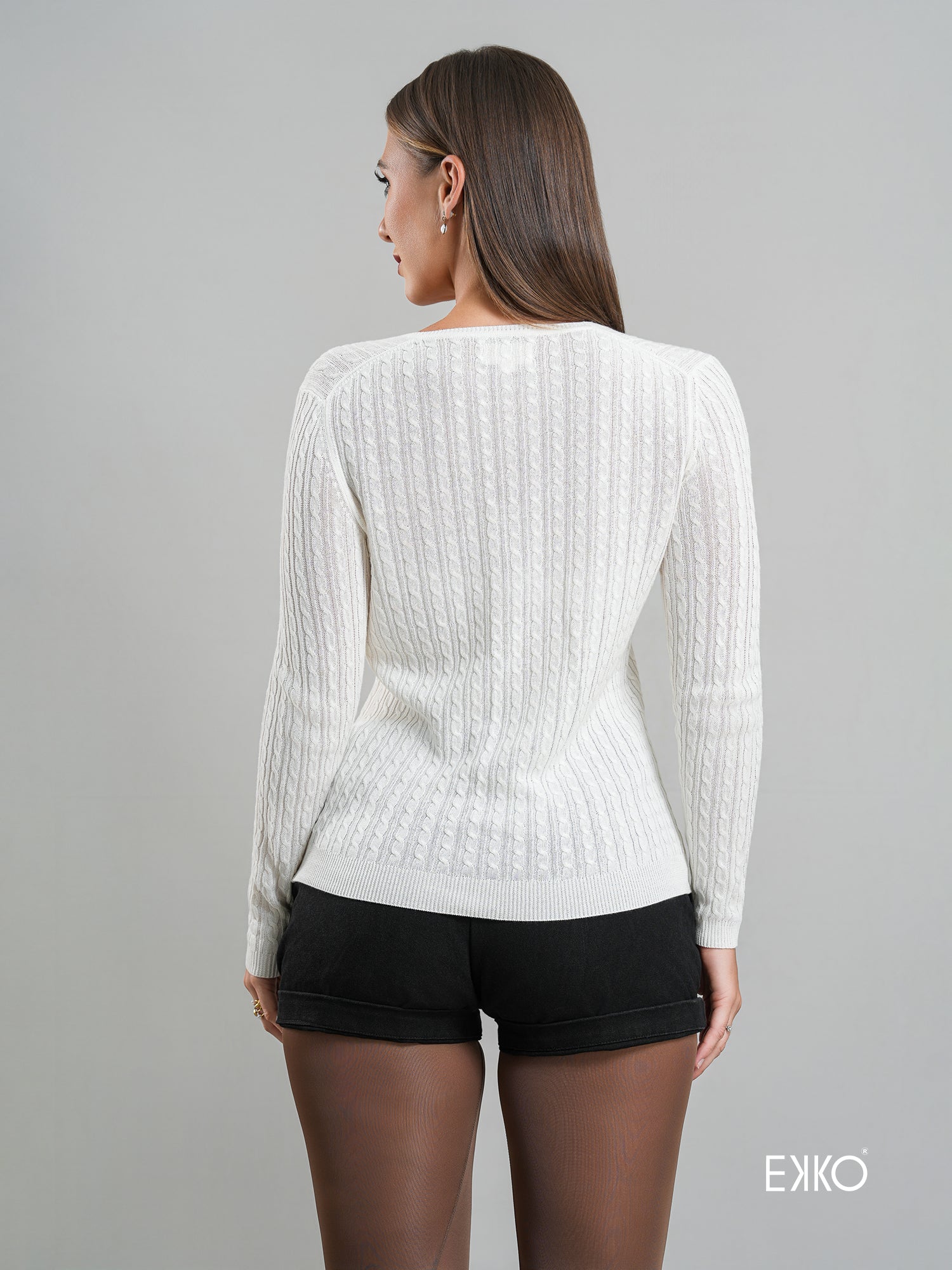 Cozy V-neck cable-knit sweater in white, crafted from a soft 58% Viscose and 42% Cotton blend. Long sleeves, regular fit, perfect for everyday comfort.