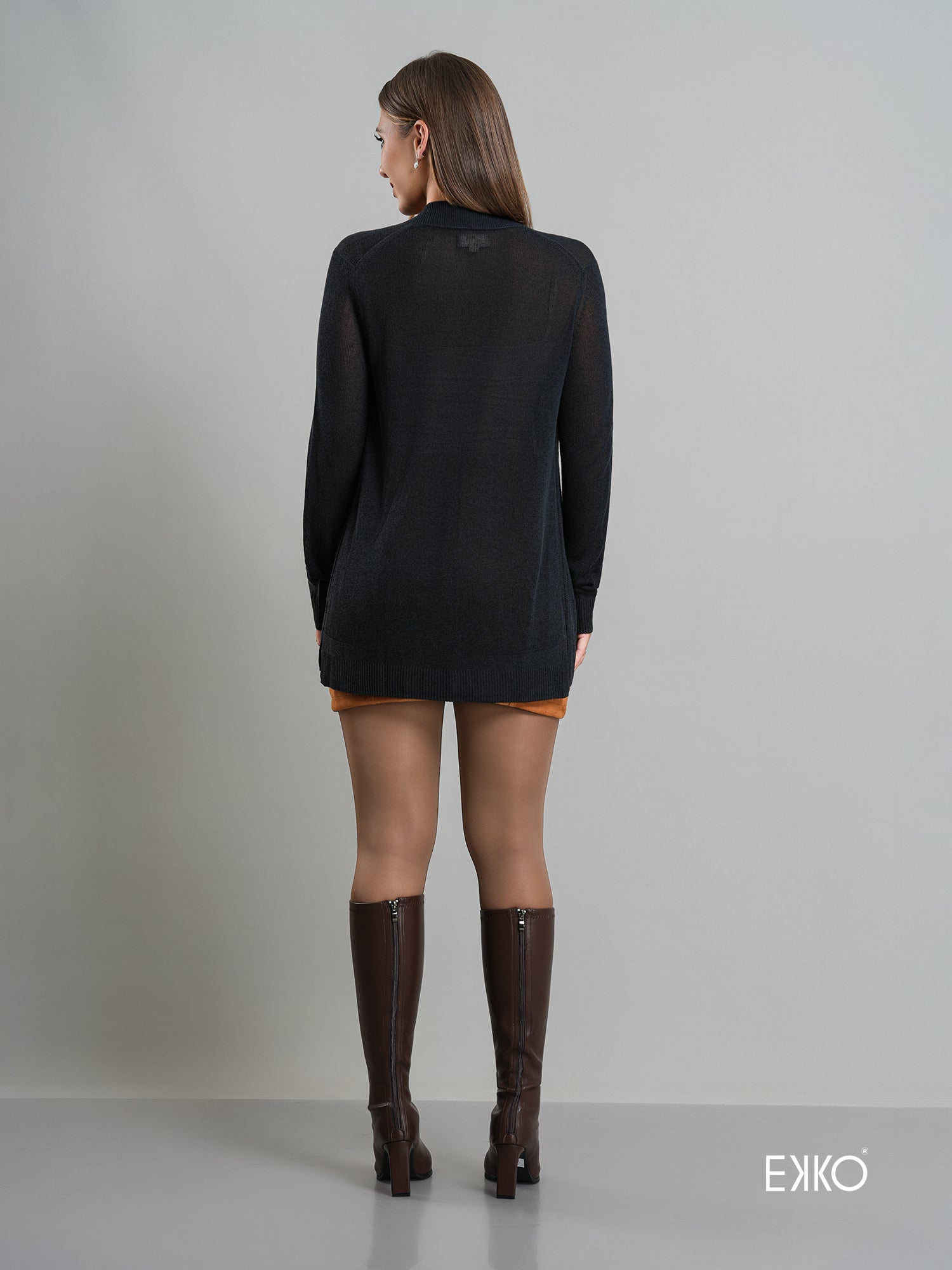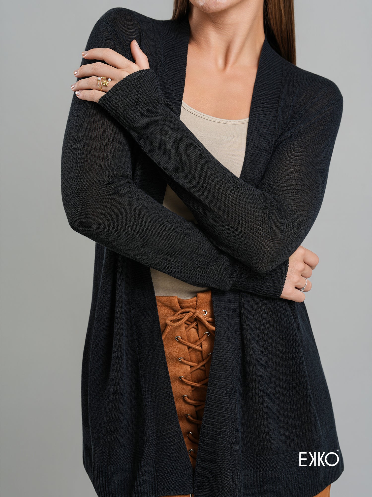 A comfy long-sleeve women’s cardigan with an open neckline and regular fit. Crafted from a soft viscose–cotton blend for all-day comfort, available in timeless black and brown, perfect for effortless layering.