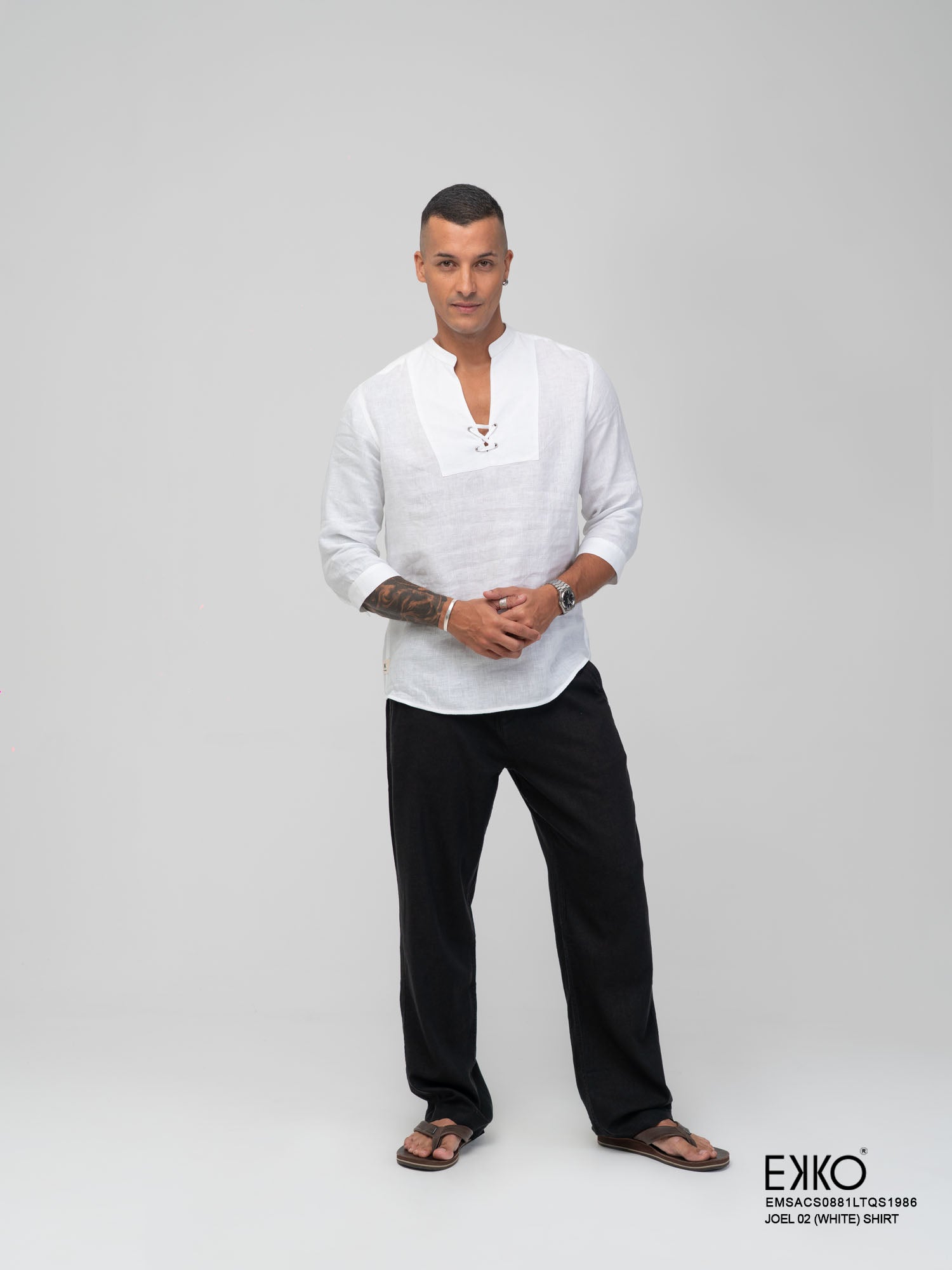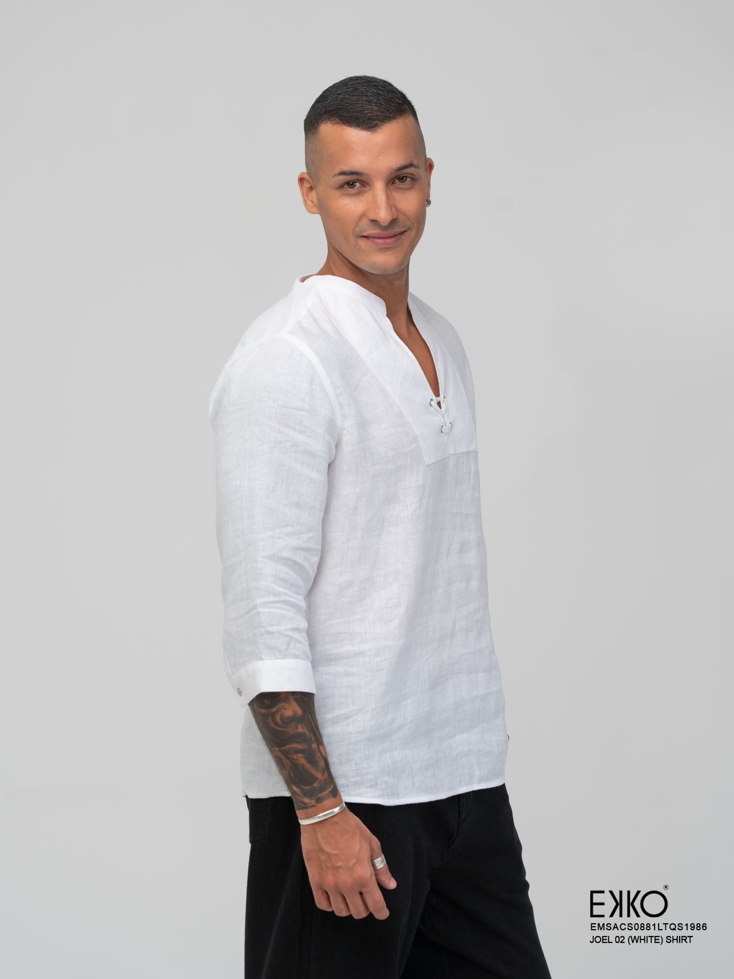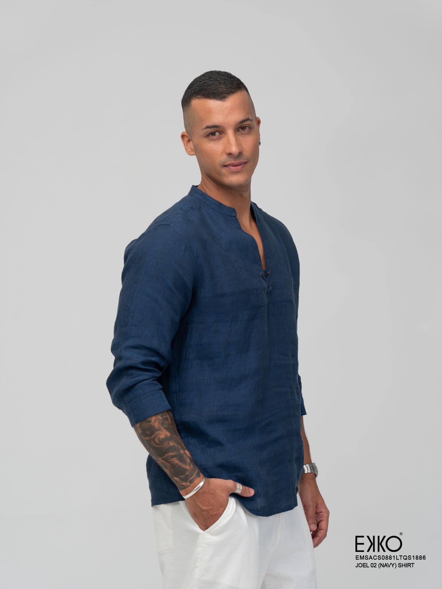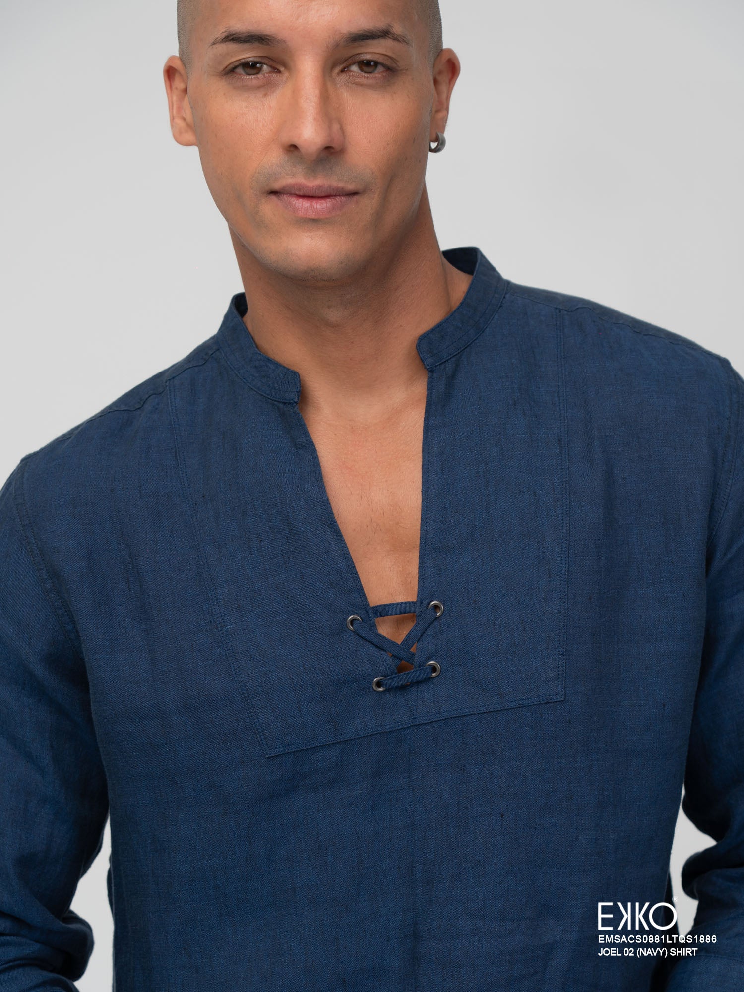 Lightweight and breathable, this 100% linen shirt features 3/4 sleeves, a mandarin collar, and front tie details that bring a handcrafted touch to everyday dressing.